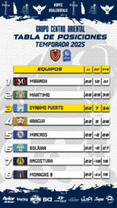El equipo Búfalo viajó al Polideportivo Yulimar Rojas en Los Teques para enfrentar al Deportivo Miranda en la jornada 22 de la Liga Futve 2, encuentro que finalizó con empate a un gol y que permite al Dynamo Puerto FC mantenerse firme en la zona de clasificación del Grupo Centro Oriental en un enfrentamiento donde se veían las caras el equipo Mirandino situado en el primer lugar de la tabla y el equipo de Anzoátegui ocupando el tercer lugar y que cierra la serie de partidos entre ambos con 4 empates en esta fase de clasificación 2025.